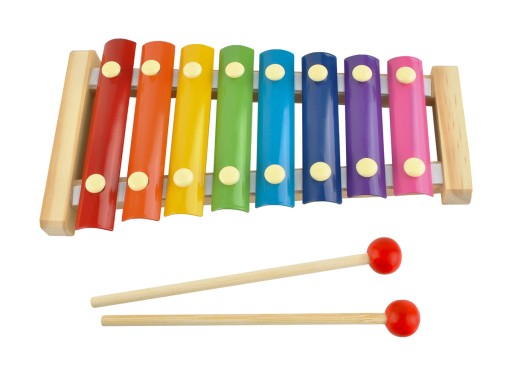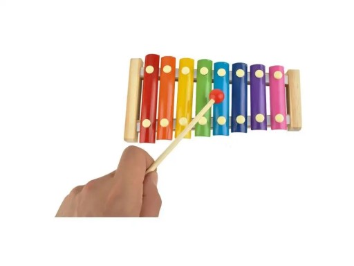 Tęczowe cymbałki to idealna zabawka edukacyjna dla najmłodszych, aby zapoznać ich z muzyką i być może zaszczepić muzyczną pasję na dalsze lata. 8 metalowych blaszek w drewnianej oprawie pozwoli na zagranie 8 różnych tonów (pełna gama), a tym samym doskonale sprawdzi się w graniu prostych melodii. Wystarczy delikatnie uderzyć dołączonymi do zestawu pałeczkami, aby wydobyć z nich dźwięk. Głośność zależy od mocy uderzenia.