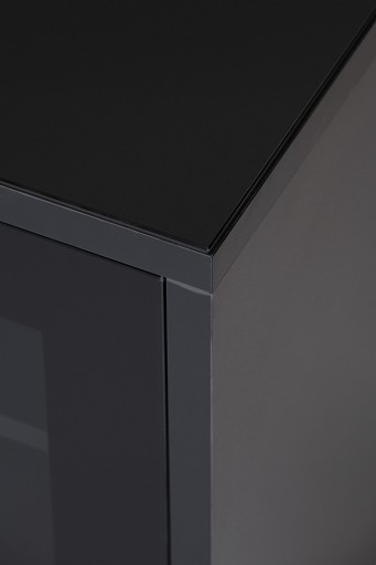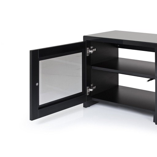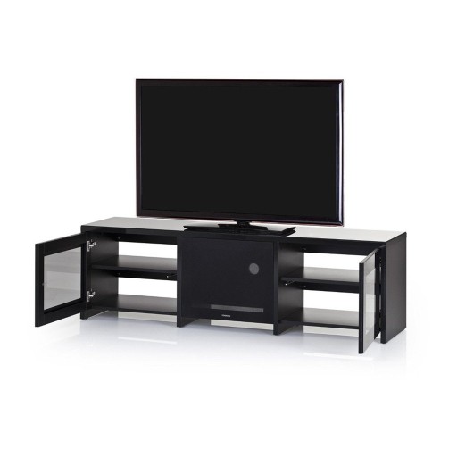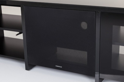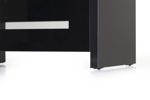 SONOROUS LB-1621 Nowoczesna szafka audio video. Wykonana z płyty MDF, wykończona okleiną winylową w kolorze czarnym. Stolik posiada sześć półek, które pomieszczą mniejszy i większy sprzęt audio video, lewa i prawa półka zamykana szklanymi drzwiczkami, środkowa tkaniną akustyczną. Szerokość stolika to 161 cm, wyposażony w system zarządzania kablami.