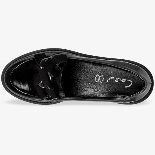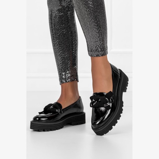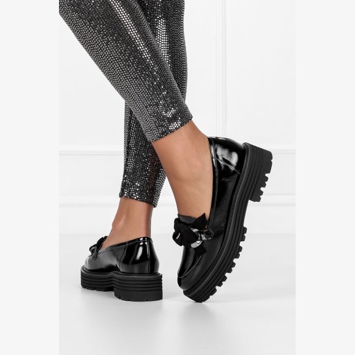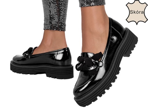 Czarne mokasyny damskie model 2523 zostały wyprodukowane w Polsce z najlepszych gatunków skór. Ręczne wykonanie butów gwarantuje doskonałą jakość, wygodę i dopasowanie do stopy. Wnętrze obuwia zostało wytworzone z wysokiej jakości skóry, która zapewnia maksymalny komfort użytkowania. To niezwykle stylowe obuwie, które idealnie łączy elegancję z casualowym wyglądem. Lakierowana skóra nadaje im uroku, dzięki czemu świetnie pasują zarówno do codziennych, jak i bardziej formalnych stylizacji. Ozdoba umieszczona na cholewce dodaje temu fasonowi luksusowego akcentu, przyciągając wzrok i nadając im unikalnego charakteru. To efektowny detal, który podkreśla ich elegancki wygląd. Podeszwa z rowkami to praktyczne rozwiązanie, które gwarantuje doskonałą przyczepność na różnych powierzchniach. Nie tylko sprawia, że mokasyny są stabilne i wygodne w chodzeniu, ale również dodaje im pewnej sportowej dynamiki, co jest świetnym połączeniem z ich klasycznym designem. Są doskonałym wyborem dla osób, które cenią sobie wyjątkowy styl, komfort i jakość wykonania. Sprawdzą się zarówno na co dzień, uzupełniając casualowe outfity, jak i na bardziej oficjalne okazje, gdzie dodadzą uroku i szyku do każdej stylizacji. Wybierz swojego faworyta wśród mokasynów dostępnych na Casu.