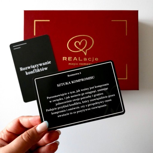 ✅ „REALacje” to unikalny, wysokiej jakości zestaw kart dla par stworzony z myślą o Tobie i Twoim partnerze, mający na celu umocnienie Waszej relacji poprzez angażujące rozmowy na tematy związane z różnymi obszarami życia i związku.