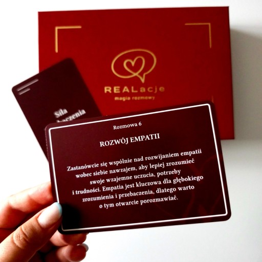 Ten niesamowity poziom dbałości o szczegóły sprawia, że REALacje - magia rozmowy to nie tylko przyjemny do użycia, ale także piękny estetycznie produkt. Wszystko to powoduje, że zestaw kart dla par stanowi doskonały upominek, który będzie się wyróżniać swoją jakością, elegancją, a także niezwykle wartościową merytorycznie zawartością.