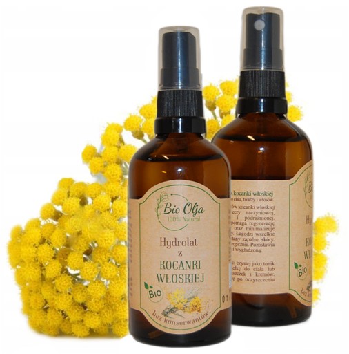 Hydrolat z kocanki włoskiej pozyskiwany jest tylko ze świeżo zerwanych kwiatów, dzięki czemu, pełen jest zbawiennych dla skóry składników i wartości, które nie tylko pomogą Ci w utrzymaniu świetnej kondycji cery, ale również mają wpływ na Twoje samopoczucie. Naturalna woda z kwiatów kocanki włoskiej ma silne działanie przeciwzapalne, pomaga w leczeniu chorób i problemów skórnych. Intensywnie wspomaga regenerację skóry, przyspiesza gojenie ran oraz minimalizuje rozstępy i blizny.Świetnie sprawdzi się w pielęgnacji cery tłustej, z problemami naczynkowymi i zaczerwienieniami. Doskonale oczyszcza skórę, ściąga i zwęża pory, działa wzmacniająco na ścianki naczyń krwionośnych, przyjemnie odświeża i tonizuje. Łagodzi wszelkie podrażnienia i stany zapalne skóry. Działa przeciwalergicznie. Pozostawia cerę odświeżoną i wygładzoną.