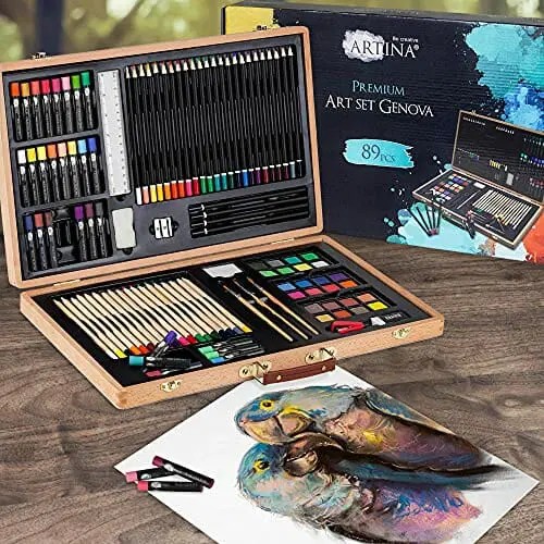 Artina 89-częściowy zestaw do malowania z walizką Genova – zestaw artystyczny XXL w walizce drewnianej – pudełko z kredkami woskowymi, zestaw kredek, akwareli