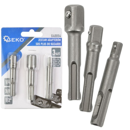 Adaptery wykonane zostały z wytrzymałej stali chromowo-wanadowej (CrV). Zestaw adapterów umożliwia stosowanie przy wiertarce z uchwytem SDS-Plus nasadek na 1/2”, 3/8” oraz 1/4”.