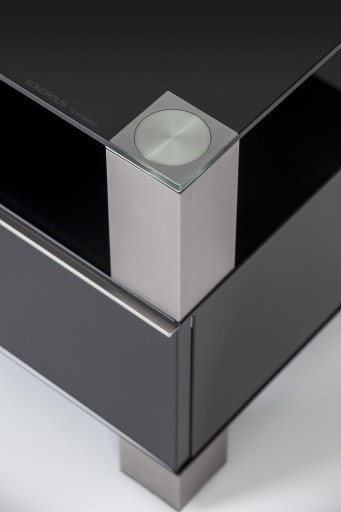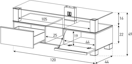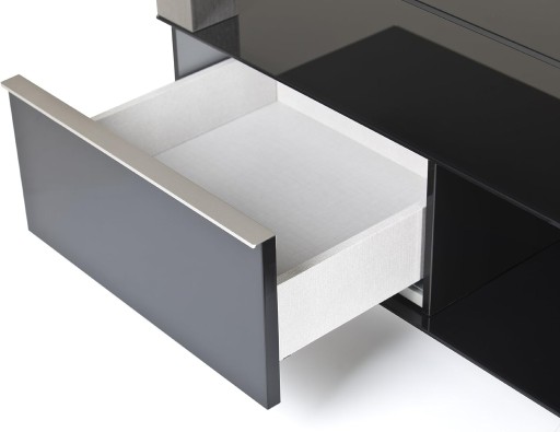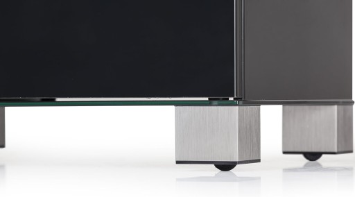 MD9120 HIGH GLOSS Nowoczesny stolik na sprzęt audio-video. Wyposażony w dwie półki i dwie zamykane szafki. Górny blat przeznaczony na telewizora o przekątnej max. 50 cali, druga półka np. na głośnik centralny lub sprzęt audio. Dolna półka również zapewnia dużo miejsca oraz odpowiednią wentylację dla umieszczonego w niej np. wzmacniacza. Szerokość stolika to 120 cm, obudowa lakierowana high gloss. Powierzchnia pokryta jest specjalnym 8-warstwowym lakierem, dostępnym w czterech kolorach. Półki wykonane z hartowanego szkła z polerowanymi krawędziami dostępne w wersji przeźroczystej lub lakierowanej od spodu na czarno, co nadaje stolikowi elegancji i nowoczesnego stylu. Pozostałe elementy konstrukcji wykonane z aluminium o kształtach kwadratowych oraz prostokątnych, wykonanych w kolorze inox lub czarnym lakierze. Stolik wyposażony w kółka oraz system zarządzania kablami.