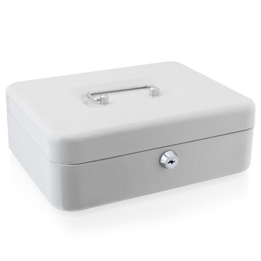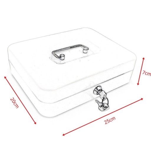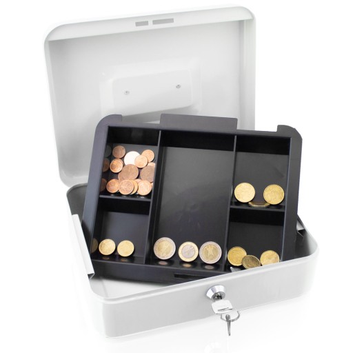 Fabrycznie nowa, wysokiej jakości metalowa kasetka do przechowywania lub transportu monet, banknotów lub innych wartościowych przedmiotów.Solidna i poręczna walizka z metalu wyposażona w sortownik do monet jest idealnym miejscem do przechowywania banknotów oraz monet. Na dole jest sporo miejsca na przykład na rachunki, paragony, monety, banknoty i inne przydatne przedmioty. Dla bezpieczeństwa kasetka jest zamykana na klucz. Ergonomiczny uchwyt sprawia że transport staje się dziecinnie prosty.