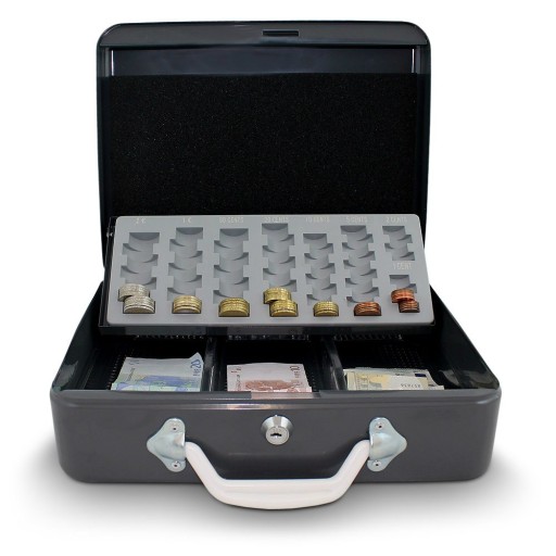 To wygodne pudełko na pieniądze jest idealnym miejscem na sortowanie i liczenie pieniędzy i monet. Dzięki zintegrowanym gniazdom we wkładzie masz szybki dostęp do monet o różnych wartościach - bez przeszukiwania. W dolnym obszarze dużo miejsca to np. za banknoty, pokwitowania, monety, bilety - nawet małe znaczki mają teraz swoje miejsce.