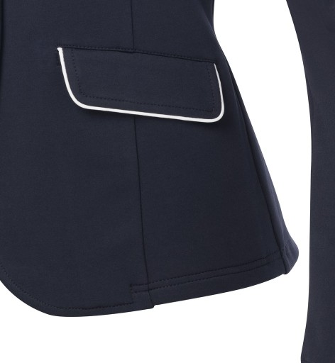 Kontrastowa lamówka wokół kołnierza, klap kieszeni i końcówek rękawów.