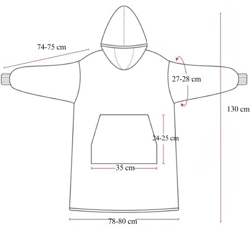 Pełni funkcję bluzy jak i koca. Z przodu posiada dużą kieszeń, która nie tylko ogrzeje dłonie, ale również pozwoli na przechowywanie rzeczy takich jak telefon, pilot, książka i wiele innych. Duży kaptur może służyć jako poduszka np. podczas podróży, bądź czytania książki na kanapie, czy też oglądania ulubionego serialu.