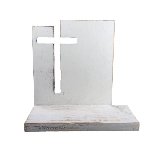Drewniana statuetka z prostokątną podstawą i wyciętym symbolem krzyża.