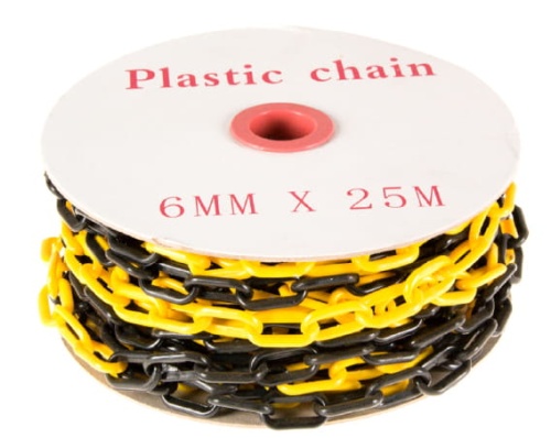 Łańcuch plastikowy grubości 6 mm wykonany z polietylenu (PE) wysokiej jakości dostępny w kolorze żółto-czarnym. Charakterystyczne barwy umożliwiają dostrzeżenie go nawet z dużej odległości. Wysoka jakość tworzywa czyni go odpornym na rozmaite uszkodzenia. Łańcuchy plastikowe są dostępne w opakowaniach po 25 metrów bieżących. Cena łańcucha plastikowego, która jest podana, dotyczy 1 metra bieżącego. Plastikowy łańcuch służyć może w celu zapewnienia bezpieczeństwa podczas prac budowlanych, drogowych, miejsc pracy oraz organizacji eventów. Świetnie sprawdza się wykorzystywany w celu wygrodzenia tymczasowo zamkniętych stref. Łańcuchy łączone mogą być również z różnymi akcesoriami lub słupkami.