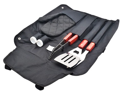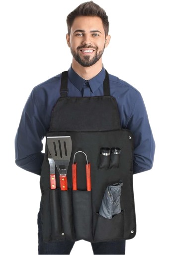 Główną zaletą zestawu jest specjalny fartuch, w którym zmieścimy wszystkie potrzebne przybory do smażenia na grillu lub gotowania. Poczuj się jak prawdziwy mistrz kuchni!