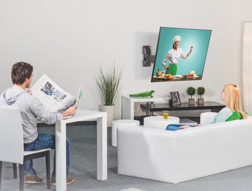 Zamocowany na ścianie telewizor można regulować tak, by mieć jak najlepszą widoczność w różnych miejscach pomieszczenia. Ekran można pochylać, przesuwać na boki oraz odsuwać od ściany.