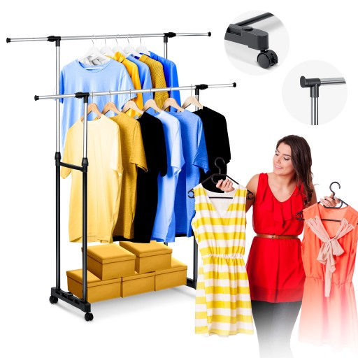 Prezentowany wieszak ma dwa uchwyty np. na krawaty itp. Praktyczny dla studentów, podczas remontu, sprawdzi się w domowej garderobie, jak też na płaszcze dla gości. Idealne dla rodziny posiadającej dzieci, dzięki swojej regulowanej ergonomicznej wysokości.