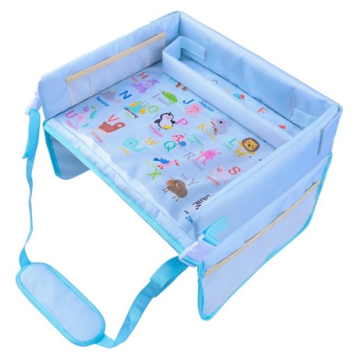 Wykonany jest z miękkich elementów. Podwyższone boki stolika zapobiegają spadaniu znajdujących się na nim przedmiotów. Stolik posiada pojemne, boczne kieszenie wykonane z elastycznej siatki które pomieszczą dodatkowe akcesoria.