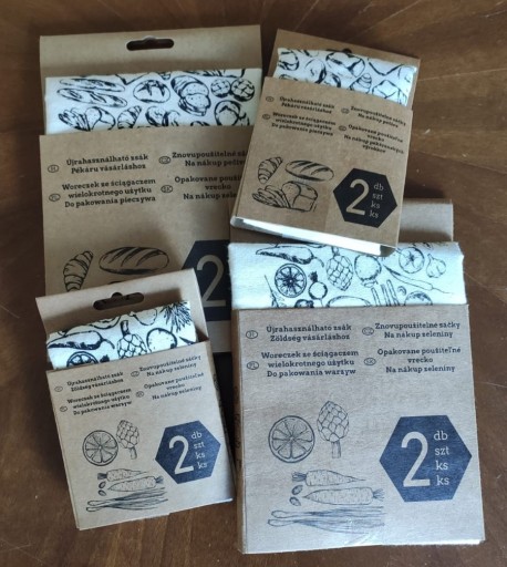 Łącznie do 8 bawełnianych worków z motywami pieczywa oraz owoców, w dwóch rozmiarach.