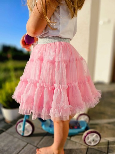 ✅Spódniczka tiulowa uszyta z wielu warstw materiału w tradycyjnym odcieniu różu. Dodatkową ozdobę stanowi szeroka, brokatowa guma w kolorze srebrnym. Podszewka została wykonana z połyskliwej tkaniny dobranej pod kolor tiulu.