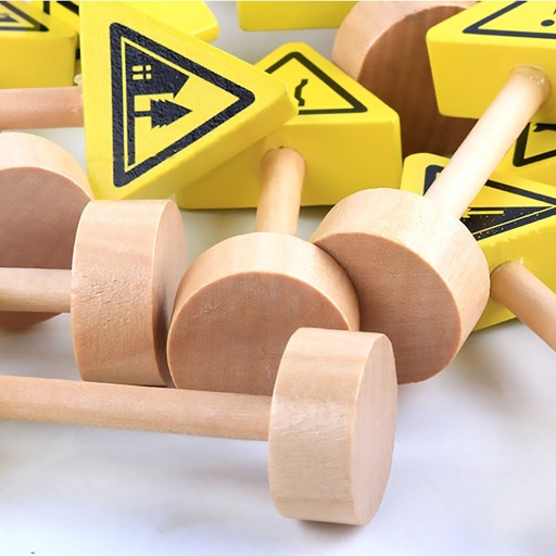 Zestaw drewnianych znaków drogowych. Pomoże w nauce zasad ruchu drogowego i uatrakcyjni zabawę samochodzikami. Zestaw zawiera 50 dwustronnych znaków na podstawkach.