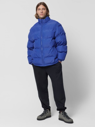 Kobaltowa męska kurtka puchowa puffer z szerokim pikowaniem. Wysoka stójka chroni przed wiatrem i chłodem. Dwie kieszenie boczne i jedna wewnętrzna z zapięciem na napy pomieszczą niezbędne przedmioty. Zamek z masywnym pullerem i wewnętrzną listwą zabezpieczającą przed chłodem. Szerokie rękawy wykończone są ściągaczem z gumą. Dolna regulacja ze stoperem ułatwia dopasowanie. Kurtka z puchem syntetycznym, nawet przy kontakcie z wilgocią, zachowuje swoje właściwości izolacyjne przez dłuższy czas oraz o wiele szybciej schnie. Dodatkowo nie wymaga skomplikowanego procesu prania i suszenia. Kurtka posiada również hydrofobową impregnację, która chroni przed lekkimi opadami. Żywy, kobaltowy kolor przyciąga uwagę i dzięki niemu wyróżnisz się z tłumu.
