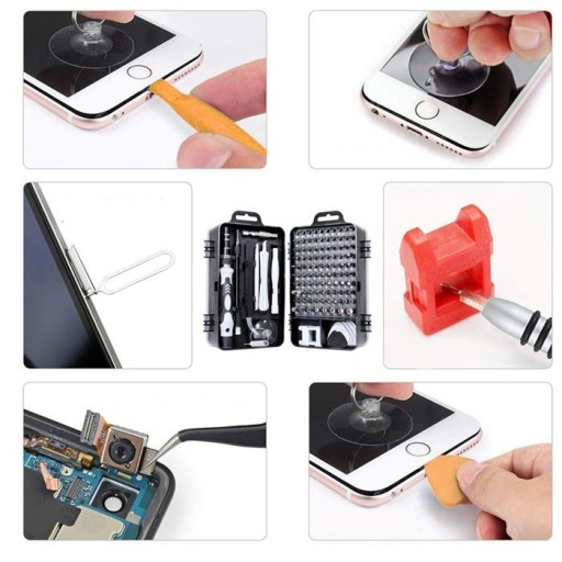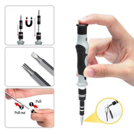 Zestaw precyzyjnych wkrętaków z magnetycznymi końcówkami o szerokim zastosowaniu. Pozwala na samodzielne dokonanie drobnych napraw serwisowych. Rozbudowany zestaw precyzyjnych narzędzi- aż 115 elementów, 98 wkrętaków oraz wiele innych przyborów do profesjonalnych napraw. Komplet śrubokrętów do serwisowania tabletów, laptopów, konsoli do gier i wielu innych przedmiotów. Zbiór wkrętaków zapakowany w poręczne etui dla łatwego przechowywania i przetransportowania. Wymienne bity o różnych rozmiarach i kształtach, które będziesz mógł zamontować na uniwersalnym uchwycie pozwolą Tobie zaoszczędzić miejsce w warsztacie i Twojej skrzynce narzędziowej. Zestaw znajdzie zastosowanie w naprawie praktycznie każdego urządzenia jest to niezbędne narzędzie w każdym domu.