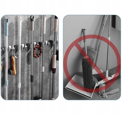 - Nie zajmuje dużo miejsca – dzięki 5 uchwytom i 6 haczykom, uchwyt na miotłę zawiera łącznie 11 miejsc gotowych do wykorzystania.