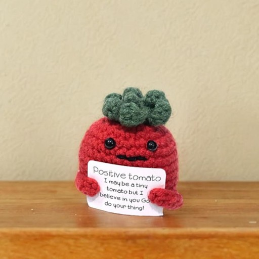 [Dziergająca lalka ziemniaczana]: Mała urocza lalka ziemniaczana, ręce trzymające pozytywne karty, wesoły uśmiech.