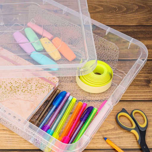 Estetyczny wygląd w kolorze przezroczystym sprawia, że pojemnik pasuje do każdego wnętrza, dodając elegancji i harmonii. Przezroczystość pozwala szybko zlokalizować potrzebne przedmioty bez konieczności otwierania go, co oszczędza czas i ułatwia organizację.