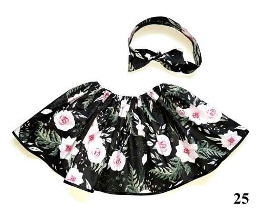 1) Bawełnianej rozkloszowanej spódniczki w oryginalnych 30-stu wzorach. Spódniczka dołem wykończona satynową białą lub czarną lamówką. Osadzona na gumce. Spódniczka nie traci kształtu dzięki czemu efektownie się układa.