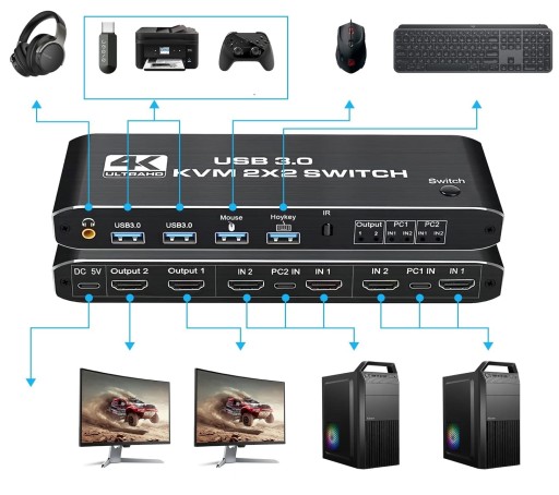 Przełącznik KVM pozwala podłączyć 2 komputery do 2 monitorów i używając jednocześnie jednego zestawu klawiatury z myszką.