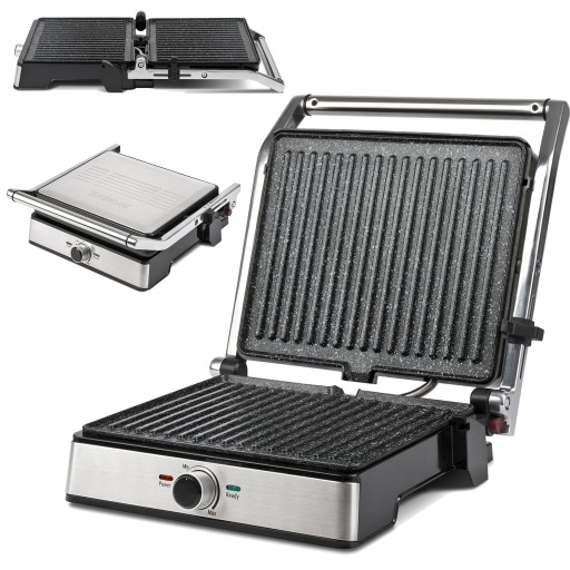 Urządzenie jest wyposażone w dwie duże, nieprzywierające płytki przypominające kamień, które pozwalają na zdrowsze, naturalne i beztłuszczowe gotowanie. Posiada duży uchwyt zapobiegający oparzeniom, pokrętło do regulacji temperatury i blokadę grilla, aby utrzymać urządzenie zamknięte, aby przechowywać je w pionie i zajmuje mniej miejsca.