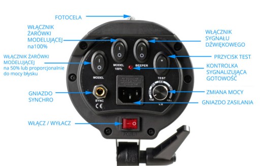 - Sposoby wyzwalania: przycisk TEST / kabel Synchro / Slave (fotokomórka)