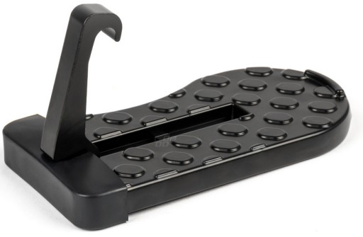 Uniwersalny, aluminiowy podest samochodowy, który został zaprojektowany jako dodatkowy stopień ułatwiający dostęp do dachu pojazdu. Montaż tego podestu jest prosty i wygodny, nie wymaga inwazyjnych działań. Można go zamontować na elemencie zamka drzwi w karoserii samochodu, a specjalna guma na uchwycie chroni karoserię przed zarysowaniami.