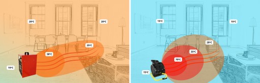 - Wysoki przepływ powietrza - szybkie i równomierne ogrzewanie