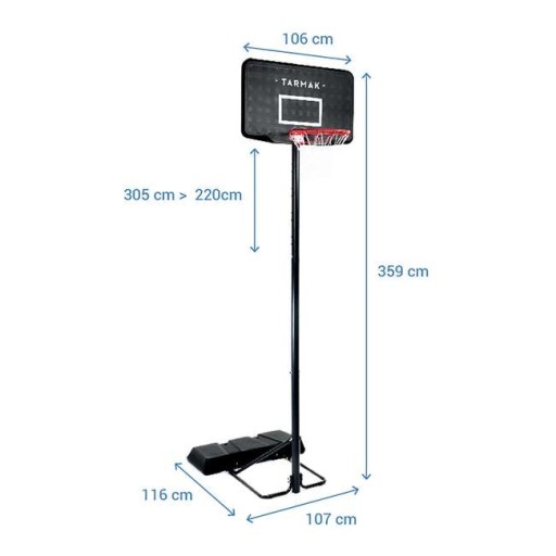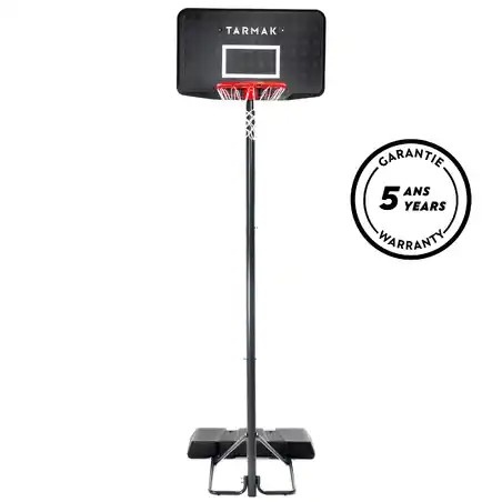 Kosz do koszykówki B100 Tarmak jest idealny dla początkujących. Pozwala na ustawienie 5 różnych wysokości gry: od 2,20 m dla dzieci od 8 roku życia, do 3,05 m (oficjalna wysokość). Kosz można dopasować do wieku i poziomu zaawansowania gracza. Idealny dla całej rodziny, stabilny (podstawa o poj. 46 litrów) i trwały (metalowy słup). W zestawie znajduje się siatka do kosza.