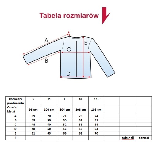 Wymiary podane w tabeli mierzone są po zewnętrznej stronie kurtki, podane są w centymetrach i dotyczą wyrobu !!!