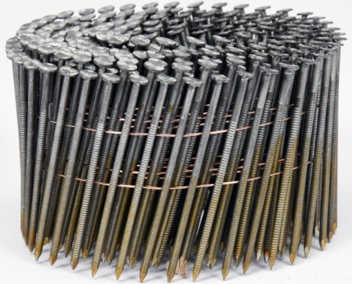 Gwoździe przeznaczone do gwoździarek bębnowych. Najbardziej popularne gwoździe w przemyśle drzewnym. Ilość gwoździ w jednym zwoju około 300 szt.,