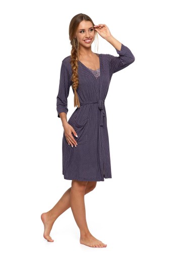 Szlafrok damski, uszyty z miękkiej w dotyku wiskozy. Posiada praktyczne wiązanie na sznurek oraz kieszenie. Dzięki niewielkiej domieszce elastanu materiał jest sprężysty i dobrze układa się na sylwetce. Model zdobi drobny wzór w serduszka.