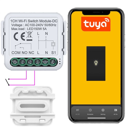 Moduł do puszkowy, sterownik bez potencjałowy WiFi Tuya NO / NC do sterowania ON/OFF:oświetleniem, bramami, siłownikami, sterowaniem drzwiami, sygnalizacją przycisków, sterowanie komputerem, kontrola dostępu, kotłami, piecami, bramą lub dowolnym urządzeniem które potrzebuje sygnału bez potencjałowego lub 230V. Wszystkie te funkcje wykorzystasz dzięki pomocy urządzeń mobilnych, instalacja jest bardzo prosta i intuicyjna.