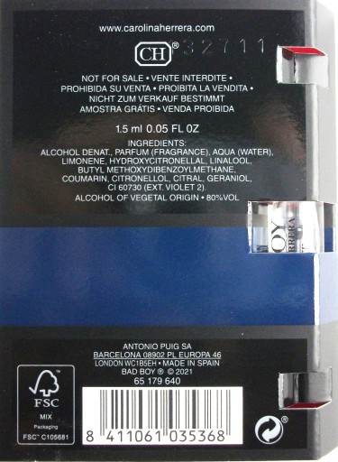 Próbka wody perfumowanej dla mężczyzn Carolina Herrera Bad Boy Cobalt o pojemności 1,5 ml z atomizerem. Promocja. Przy zakupie 10 szt. dodatkowo taka sama próbka gratis.