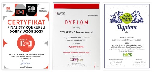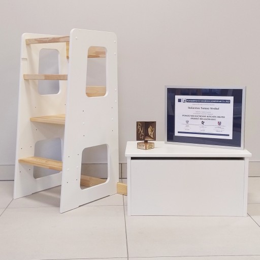 Konstrukcja została wzmocniona u podstawy dodatkową deseczką przeciwdziałając przechyleniu pomocnika, a boki zaokrąglone - aby produkt był trwały i bezpieczny.