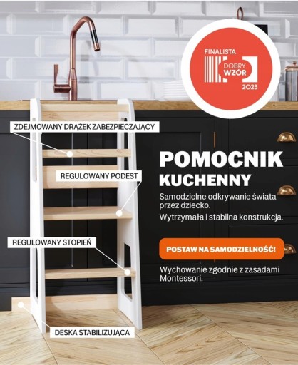 Pomocnik kuchenny to wysokiej jakości produkt, umożliwiający w bezpieczny sposób odkrywać świat w zasięgu ich ręki poprzez zaangażowanie i interakcję w codziennych rodzinnych zajęciach, jak uczestniczenie w czynnościach związanych z przygotowaniem posiłków, szczotkowaniu zębów przy umywalce etc. Niewątpliwym atutem jest zachęcanie dziecka do samodzielności oraz rozwijanie umiejętności manualnych związanych z codziennym życiem, co przekłada się na rozwój motoryczny małego człowieczka.