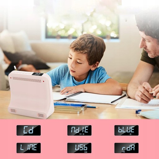 - Odtwarzacz CD ma 5 trybów odtwarzania: tryb odtwarzania CD, tryb Bluetooth, tryb radia FM, tryb USB i tryb AUX/LINE. Jako odtwarzacz CD obsługuje formaty audio CD, CD-R, CD-RW, MP3 i WMA. Można go ustawić jako wyłącznik czasowy, aby zatrzymać odtwarzanie (30-80 minut).
