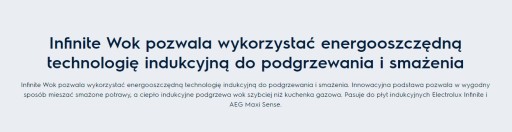 Infinite Wok pozwala wykorzystać energooszczędną technologię indukcyjną do podgrzewania i smażenia. Innowacyjna podstawa pozwala w wygodny sposób mieszać smażone potrawy, a ciepło indukcyjne podgrzewa wok szybciej niż kuchenka gazowa. Pasuje do płyt indukcyjnych Electrolux Infinite i AEG MaxiSense.POZNAJ ZALETY INFI WOKA Infinite Wok pozwala wykorzystać energooszczędną technologię indukcyjną do podgrzewania i smażenia. Innowacyjna podstawa pozwala w wygodny sposób mieszać smażone potrawy, a ciepło indukcyjne podgrzewa wok szybciej niż kuchenka gazowa. Pasuje do płyt indukcyjnych Electrolux Infinite i AEG Maxi Sense.