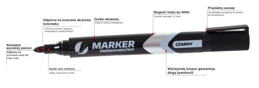 Marker stały, idealny do rysowania po różnorodnych powierzchniach, takich jak metal, tworzywa sztuczne, drewno. Posiada okrągłą końcówkę z małą główką, która umożliwia tworzenie wąskich, wyraźnych i długotrwałych śladów.