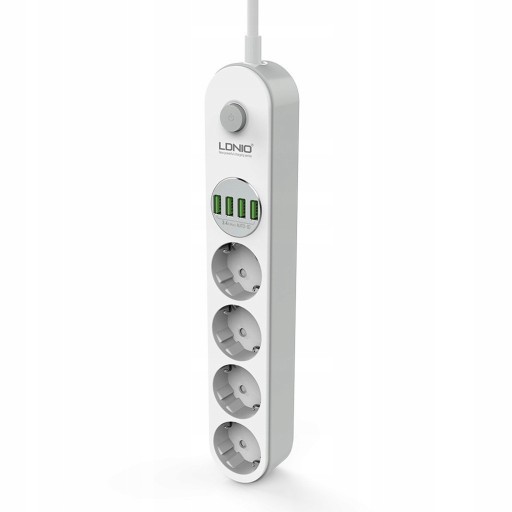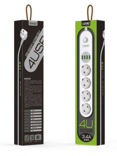 LDNIO SE4432 - niezawodna listwa zasilająca dzięki której możemy mieć podpiętych jednocześnie 8 urządzeń. Cztery urządzenia wpinamy standardowymi wtyczkami prądowymi, dodatkowe cztery do portów USB, które mają automatyczne dopasowanie natężenia prądu do podłączonego urządzenia max do 3.4A.