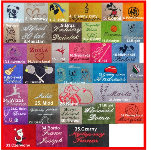 Poniżej wszystkie kolory, przykładowe hafty na wszystkich kolorach, kolory wraz z haftami.