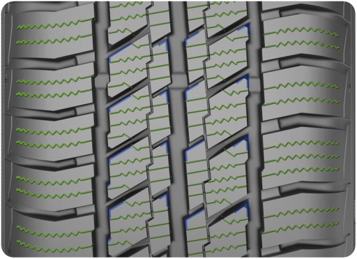 - Szerokie rowki obwodowe i boczne zapewniają odporność na aquaplaning
