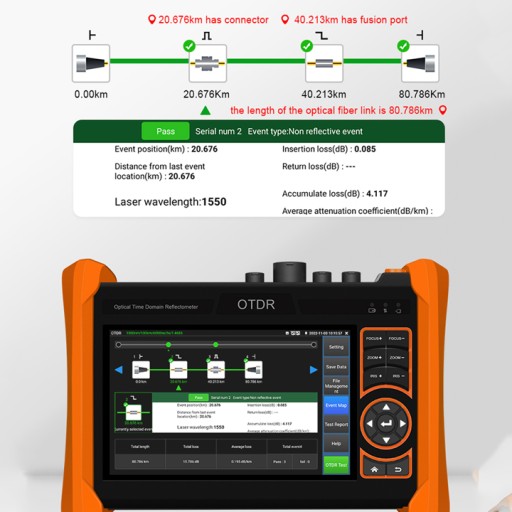 Tester rozpoznaje ROADMAP danej instalacji w sieci światłowodowej. Tester rozpoznaje wszystkie punkty z dokładnością do metra! Wyświetla również wiele innych przydatnych specyfikacji pomiaru OTDR.