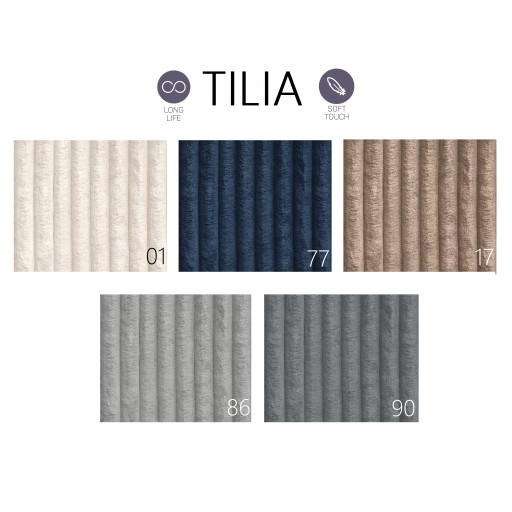 Tilia - bardzo miękki, przyjemny plusz. Struktura w wyraźne, grube, odczuwalne szerokie prążki. Materiał stworzony z myślą o najmodniejszych trendach - niebywale miękki. Tilia z pewnością doda ciepła i uroku wnętrzom, zachęcając do relaksu i wypoczynku...Tkanina wyróżnia się cieniowaniem i połyskiem, w związku z czym odcień nie jest jednolity a zmienny w zależności od ułożenia, dotyku, oświetlenia i zapewnia ciekawą grę kolorów... Paleta barw pozwoli sofie wkomonować się zarówno w styl retro, loft czy glamour.