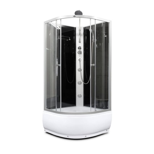 Przestronna półokrągła kabina prysznicowa z wygodnymi przesuwnymi drzwiami oraz z ergonomicznymi metalowymi uchwytami. Kabinę wyróżniają czarne ścianki tylne. Kabina wykonana z wysokiej jakości, bezpiecznego szkła transparentnego o grubości 4 mm, odznaczającego się trwałością oraz odpornością na zarysowania. Kabina w komplecie z brodzikiem, deszczownicą, słuchawką prysznicową, wężem oraz trzema dyszami masującymi.